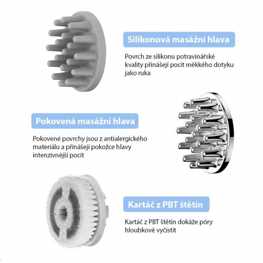 Měkká masážní hlavice používá měkké silikonové výstupky, které jemně masírují pokožku a uvolňují napětí a únavu. Zlepšuje také prokrvení pokožky hlavy. Hrubá masážní hlavice používá tvrdé výstupky, které stimulují spánek, podporují pocit uvolnění, zlepšují krevní obě a pomáhají podpořit zdravý růst vlasů. Kartáčová hlava na čistění obličeje má měkké hedvábné štětiny, které jemně čistí pleť. Sonické vibrace pomáhají štětinám lépe se dostat do pórů a odstranit z pleti nečistoty, přebytečnou mastnotu a zbytky make-upu.