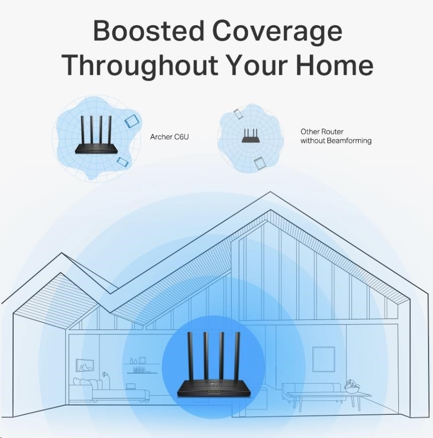 Archer C6U vytváří spolehlivou a rychlou síť s technologií Wi-Fi 802.11ac. Pásmo 2,4 GHz poskytuje rychlosti až 300 Mb/s, je připravené na každodenní úkoly, jako je odesílání e-mailů a procházení webu, zatímco pásmo 5 GHz poskytuje rychlosti až 867 Mbit/s, je ideální pro streamování videa v HD a online hraní bez zpoždění.