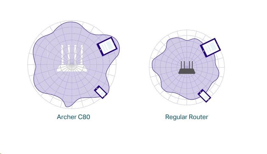 Archer C80 poskytuje vysoce výkonné a dostupné domácí Wi-Fi s celkovou rychlostí až 1900 Mb/s. Zpracovává jednoduché úkoly, jako je odesílání e-mailů nebo procházení webu v pásmu 2,4 GHz a úkoly náročné na šířku pásma, jako jsou online hry nebo streamování v rozlišení 4K/8K UHD v pásmu 5 GHz - vše bez zpoždění.