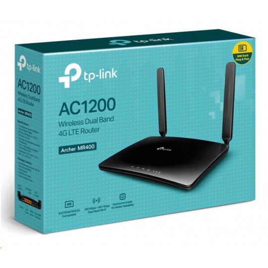 | Package Contents | AC1200 Wireless Dual Band 4G LTE Router, Archer MR400 RJ45 Ethernet Cable Power Adapter Quick Installation Guide |