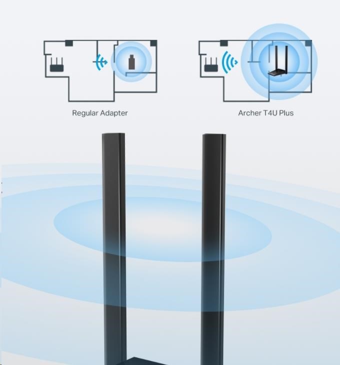 Archer T4U Plus poskytuje vašemu počítači přístup k technologii 802.11ac při příjmu signálů Wi-Fi ve dvou samostatných pásmech, čímž zvyšuje rychlost až na 1,2 Gb/s (až 400 Mb/s v pásmu 2,4 GHz a 867 Mb/s v pásmu 5 GHz). To znamená lepší síťové prostředí pro všechny vaše online potřeby. Vyberte si pásmo 2,4 GHz vhodné pro surfování, odesílání e-mailů a sociální média nebo přepněte na pásmo 5 GHz pro hraní her, streamování a stahování velkých souborů.