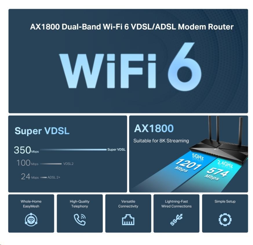 Dvoupásmový modemový router VDSL/ADSL AX1800 s WiFi6