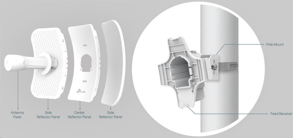 - Inovativní díly se zámkem zajišťují rychlou montáž a robustní konstrukční řešení, které udržuje CPE605 stabilní i za silného větru
