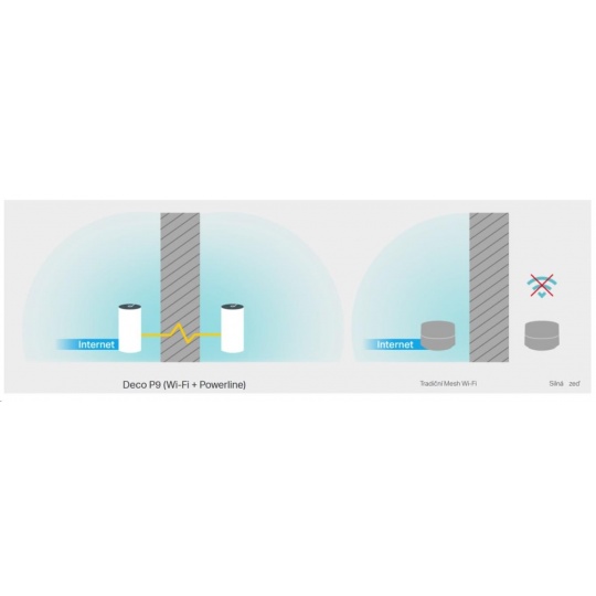 Deco P9 kombinuje duální Wi-Fi a powerline pro vytvoření silnější mesh sítě. Technologie Powerline využívá elektrické rozvody vašeho domu k vytvoření silnějšího propojení mezi jednotkami Deco tím, že snižuje dopad stěn a jiných překážek na signál a poskytuje ještě vyšší rychlosti sítě a skutečně bezproblémové pokrytí.