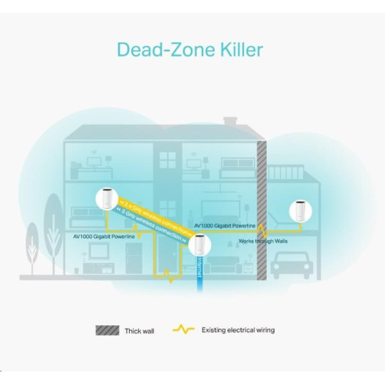 - Síť prochází stěnami a podlahami – Snižte dopad zdí a jiných překážek na signál.