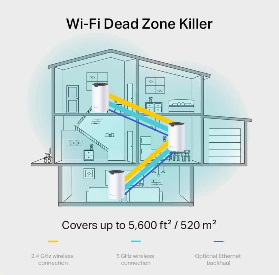 | WiFi Range | 3-5 Bedroom Houses (3-pack) TP-Link Mesh Technology Optional Ethernet backhaul works together to link Deco units to provide seamless coverage 3× Antennas (Internal) Multiple antennas form a signal-boosting array to cover more directions and large areas Beamforming Concentrates wireless signal strength towards clients to expand WiFi range |