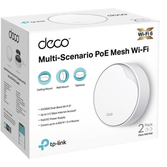 | Package Contents | 3× Deco X50-PoE units 1× RJ45 Ethernet cable 3× Power adapters Ceiling/Wall Mounting Kits Quick Installation Guide |