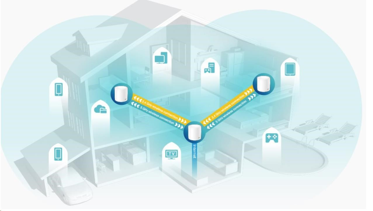 - Jedna sjednocená síť - Více jednotek tvoří domácí síť, která automaticky vybere nejlepší spojení, když se pohybujete po domácnosti.