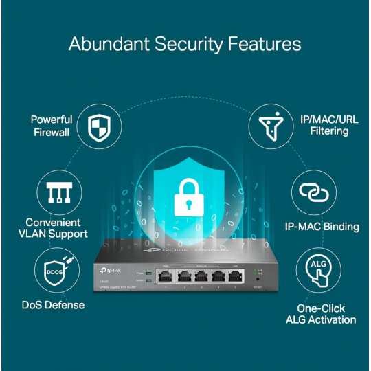 | Standards and Protocols | • IEEE 802.3, 802.3u, 802.3ab, IEEE 802.3x, IEEE 802.1q • TCP/IP, DHCP, ICMP, NAT, PPPoE, NTP, HTTP, HTTPS, DNS, IPSec, PPTP, L2TP, OpenVPN, SNMP |