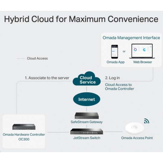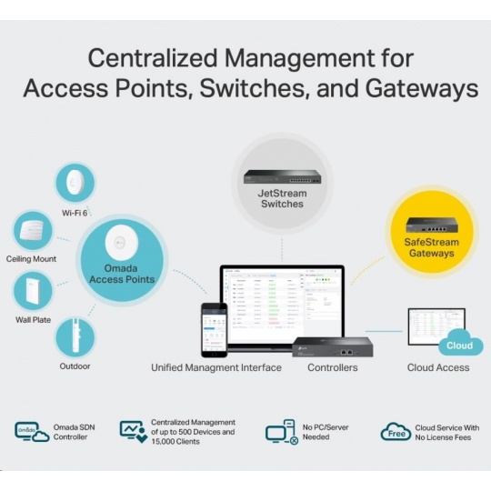 - Centralizovaná správa - až 500 přístupových bodů Omada, 100 switchů JetStream a 100 routerů SafeStream.