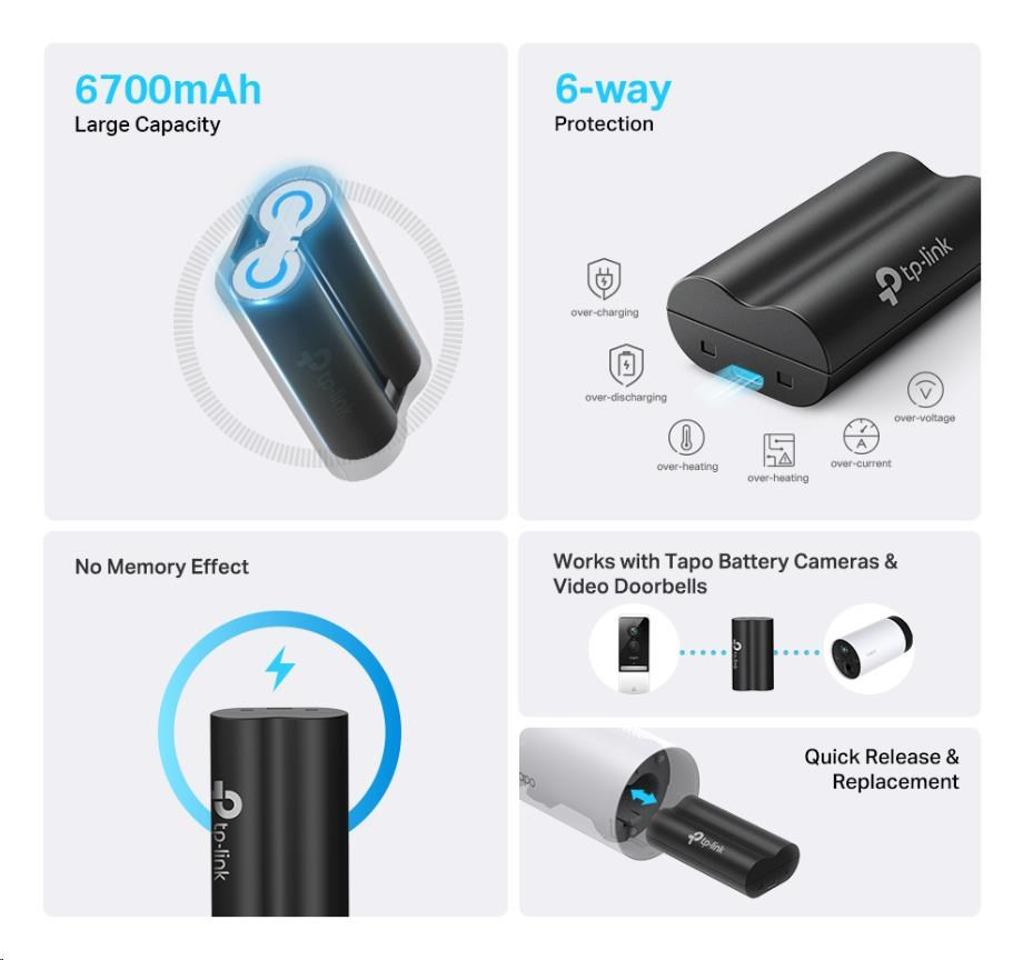 - 6700mAh Velká kapacita – Prodlužuje dobu používání (až 180 dní) vašich kamer Tapo napájených baterií a videozvonků.