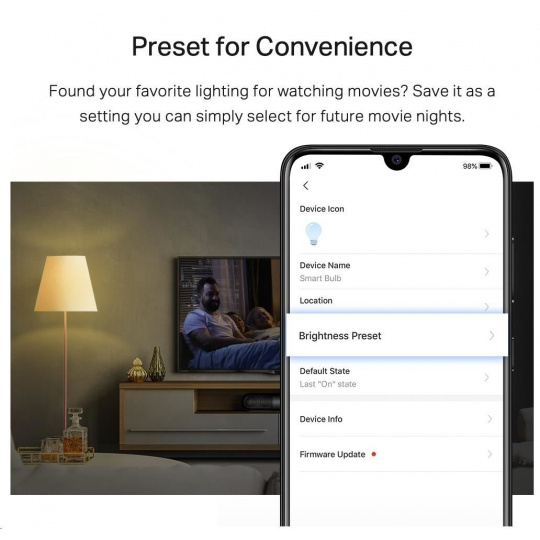 - Stmívatelná – Našli jste své oblíbené osvětlení pro sledování filmů? Uložte jej jako nastavení, které si můžete jednoduše vybrat pro budoucí filmové noci