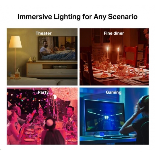 - Vicebarevná – Snadno navrhujte scénáře pro svou každodenní rutinu nebo aktivity přizpůsobením jasu, teploty světla a barev–s výběrem 16 000 000 odstínů.