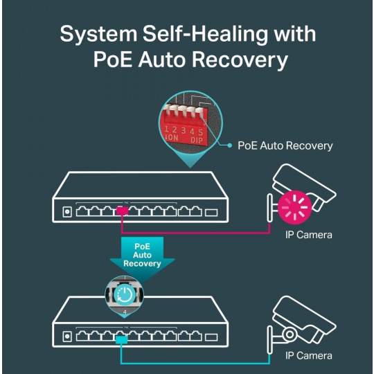 - S funkcí automatického obnovení PoE automaticky restartuje vypadlá nebo nereagující zařízení napájená přes PoE.