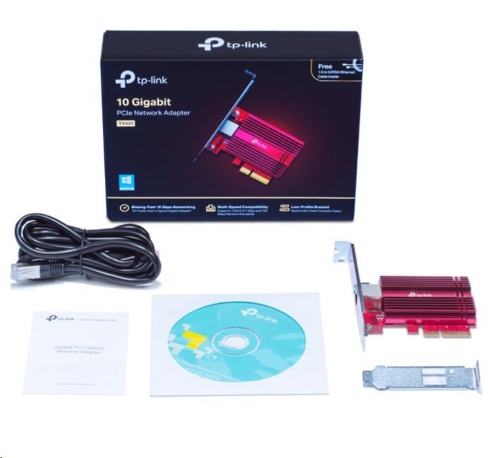 | Package Contents | 10 Gigabit PCIe Network Adapter (TX401) Standard/Low-Profile Brackets Quick Installation Guide Resource CD 1.5 m CAT6A Ethernet Cable |