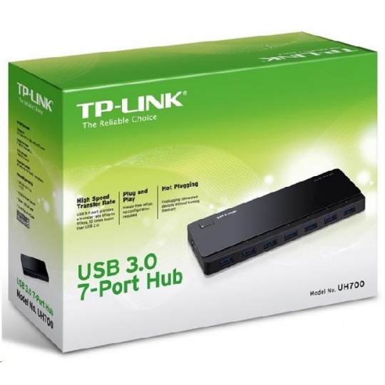 USB rozbočovač UH700 je skvělou volbou pro rozšíření USB portů počítače pro přenos dat, když potřebujete současně připojit USB disk, USB myš, tiskárnu nebo jiná zařízení. Port USB 3.0 umožňuje přenosovou rychlost až 5 Gbit/s, 10 rychlejší než USB 2.0.