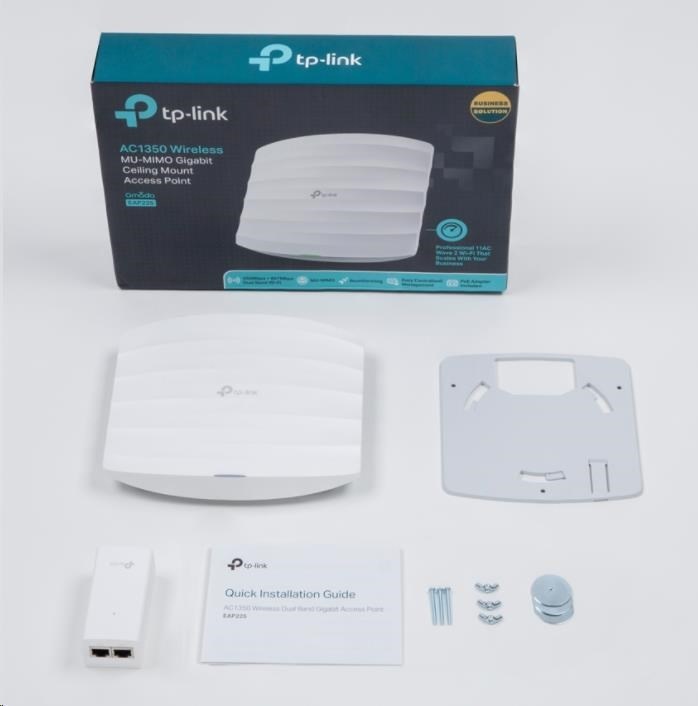 | Package Contents | • AC1350 Wireless MU-MIMO Gigabit Ceiling Mount Access Point EAP225 • Passive PoE Adapter • Power Cord • Mounting Kits • Installation Guide |