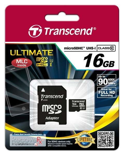 TRANSCEND MicroSDHC karta 16GB Ultimate, Class 10 UHS-I 600x, MLC + adaptér