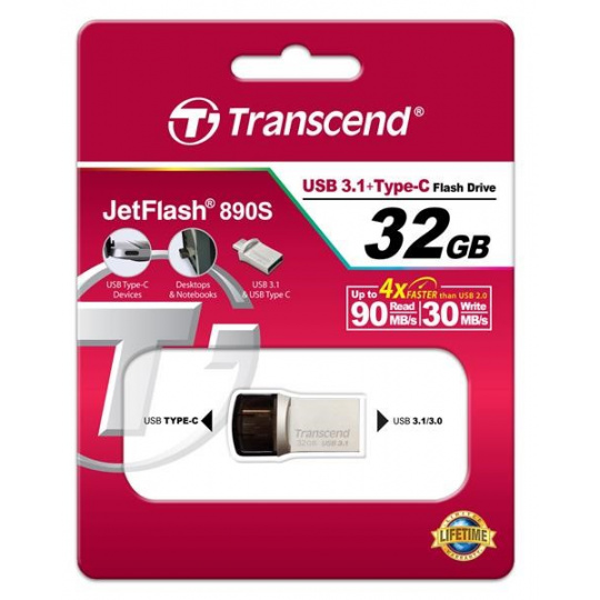 TRANSCEND Flash Disk 32GB JetFlash®890S OTG, USB 3.1 Type-C/A (R:90/W:30 MB/s) stříbrná