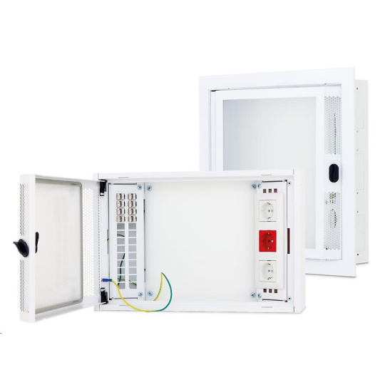 Datový modul hybridních rozvaděčů pro domovní rozvody. IP20 / IK05 Datový rozvaděč RNA je navržen pro zakončení všech domovních kabelových rozvodů a pro instalaci aktivních prvků.Je možno zde propojit Internet, televizní a satelitní rozvody, audio stejně jako klasické telefonní a ADSL spoje.Plastová výplň dveří a celá konstrukce podporují instalaci WiFi zařízení. Kabelové vstupy na horní, spodní a obou bočních stěnách rozvaděče umožňují jeho spojování do větších sestav s ostatními rozvaděči této řady včetně elektro rozvaděčů. Dveře rozvaděče jsou vystouplé směrem dopředu pro zajištění potřebného poloměru ohybu kabelů a to včetně optických. Perforace po stranách napomáhá chlazení instalovaných aktivních prvků. Montáž vybavení pomocí samořezných vrutů na vnitřní plastovou desku je rychlá a snadná. Rozvaděče jsou dodávány v modulární výšce, kde jeden modul zabírá 166 mm. V těchto modulech jsou i elektro rozvaděče této řady. Šířka i hloubka korpusu je jednotná pro všechny výšky. Rozvaděč je univerzální pro montáž na omítku nebo pro zazdění do zdi. Pro montáž do zdi je k dispozici krycí rámeček. Díky modularitě je možné použít např. 2 moduly vysokou datovou část a 1 modul elektro, vše pak zakryto 3 modulovým rámečkem. VÝKLOPNÉ BOČNÍ PANELY Boční nosné panely na obou stranách rozvaděče jsou odklopitelné pro snadnou montáž osazovaných komponent. Všechny oddělitelné nebo pohyblivé části jsou pospojeny dle normy. DATOVÉ ROZVODY Pro instalaci datových a komunikačních rozvodů jsou připraveny Keystone Standard nosiče, do kterých snadno zakončíte libovolné kabely. NAPÁJENÍ Na protější straně od datových rozvodů je příprava pro osazení napájecí soustavy 230 V. Podle velikosti rozvaděče je zde připraven otvor pro montáž klasické zásuvky (s ochrannou plastovou krabičkou) a/nebo 10“ 1U montážní otvor rozšířený o možnost instalace až 3 běžných zásuvek..