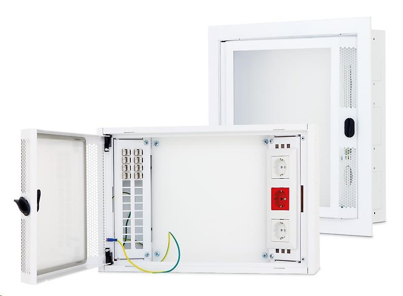 Datový modul hybridních rozvaděčů pro domovní rozvody. IP20 / IK05 Datový rozvaděč RNA je navržen pro zakončení všech domovních kabelových rozvodů a pro instalaci aktivních prvků.Je možno zde propojit Internet, televizní a satelitní rozvody, audio stejně jako klasické telefonní a ADSL spoje.Plastová výplň dveří a celá konstrukce podporují instalaci WiFi zařízení. Kabelové vstupy na horní, spodní a obou bočních stěnách rozvaděče umožňují jeho spojování do větších sestav s ostatními rozvaděči této řady včetně elektro rozvaděčů. Dveře rozvaděče jsou vystouplé směrem dopředu pro zajištění potřebného poloměru ohybu kabelů a to včetně optických. Perforace po stranách napomáhá chlazení instalovaných aktivních prvků. Montáž vybavení pomocí samořezných vrutů na vnitřní plastovou desku je rychlá a snadná. Rozvaděče jsou dodávány v modulární výšce, kde jeden modul zabírá 166 mm. V těchto modulech jsou i elektro rozvaděče této řady. Šířka i hloubka korpusu je jednotná pro všechny výšky. Rozvaděč je univerzální pro montáž na omítku nebo pro zazdění do zdi. Pro montáž do zdi je k dispozici krycí rámeček. Díky modularitě je možné použít např. 2 moduly vysokou datovou část a 1 modul elektro, vše pak zakryto 3 modulovým rámečkem. VÝKLOPNÉ BOČNÍ PANELY Boční nosné panely na obou stranách rozvaděče jsou odklopitelné pro snadnou montáž osazovaných komponent. Všechny oddělitelné nebo pohyblivé části jsou pospojeny dle normy. DATOVÉ ROZVODY Pro instalaci datových a komunikačních rozvodů jsou připraveny Keystone Standard nosiče, do kterých snadno zakončíte libovolné kabely. NAPÁJENÍ Na protější straně od datových rozvodů je příprava pro osazení napájecí soustavy 230 V. Podle velikosti rozvaděče je zde připraven otvor pro montáž klasické zásuvky (s ochrannou plastovou krabičkou) a/nebo 10“ 1U montážní otvor rozšířený o možnost instalace až 3 běžných zásuvek..