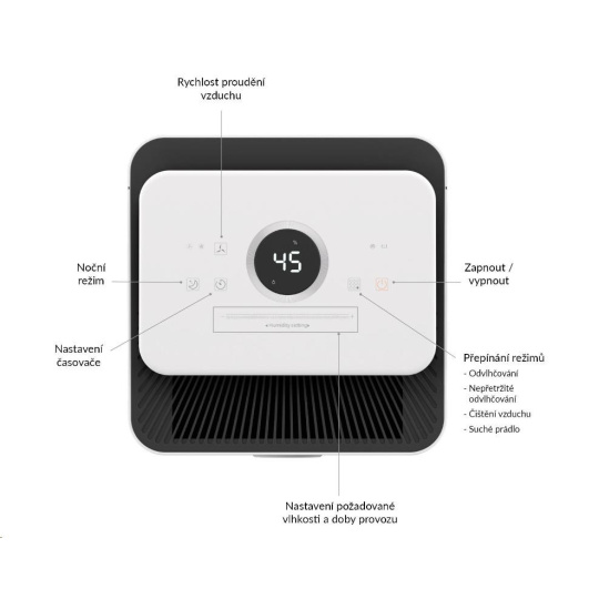 Odvlhčovač ovládáte velmi snadno pomocí dotykového panelu. Zároveň vám LED displej zobrazuje všechny důležité hodnoty.