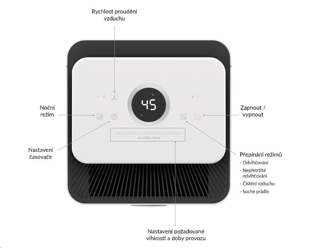 Odvlhčovač ovládáte velmi snadno pomocí dotykového panelu. Zároveň vám LED displej zobrazuje všechny důležité hodnoty.