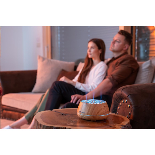 Difuzér funguje nejen jako reproduktor, ale rovněž jako zvlhčovač vzduchu, takže pokud zrovna nejste v náladě na aromaterapii, stačí naplnit nádržku pouze vodou. Pomocí jednoho tlačítka zahájíte proces zvlhčování, difuzér začne vypouštět do vzduchu v místnosti jemnou páru, která jej okamžitě začne zvlhčovat na optimální hodnotu. Správná vlhkost vzduchu působí příznivě na dýchací cesty a může pomoci při řešení problémů se suchou pokožkou, ekzémy nebo astmatem. Požadované množství páry si jednoduše nastavíte pomocí příslušného tlačítka.