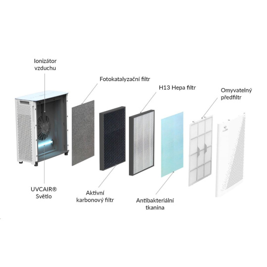 7 násobný filtrační systém odstraňuje ze vzduchu prach, pyl, zvířecí alergeny, bakterie a viry, koronaviry, spory plísní. Nejrozšířenější alergeny jsou tak ze vzduchu odstraněny.