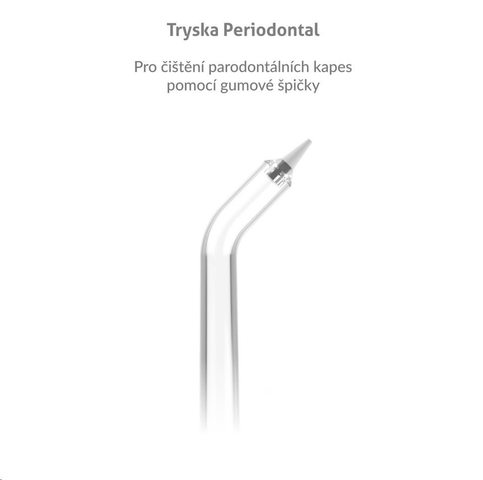 Parodontální tryska pro čištění parodontálních kapes pomocí gumové špičky.