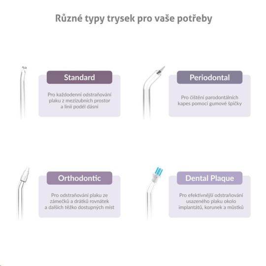 Součástí balení je 6 různých druhů trysek C-series, sprchu tak může využívat celá rodina. Další trysky pro různé dentální potřeby lze případně dokoupit.