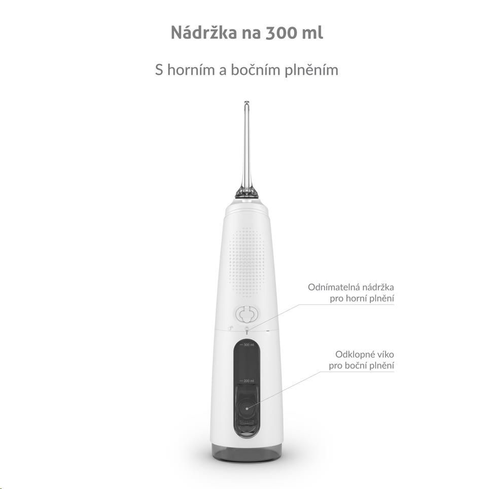 Nádržka o objemu 300 ml vystačí na vyčištění celého chrupu a zároveň je dostatečně kompaktní. Kromě obyčejné vody jí můžete naplnit ústní vodou pro extra svěžest.