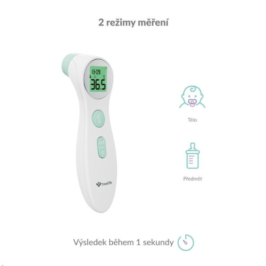 TrueLife Care disponuje dvěma režimy měření teploty. Kromě klasického měření tělesné teploty dokáže změřit i předměty, povrchy, nebo tekutiny. Snadno tak můžete zkontrolovat třeba kojeneckou stravu nebo čaj.