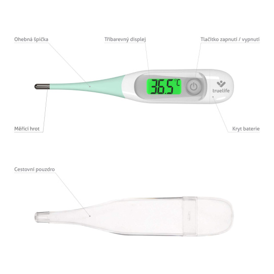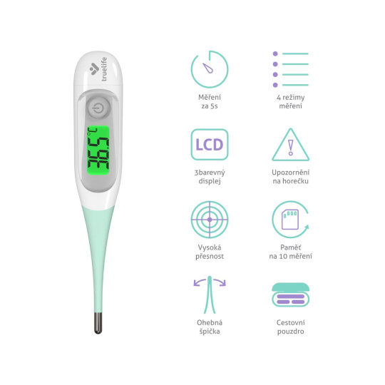 Patříte-li spíše k vyznavačům klasiky, jistě vás potěší kontaktní teploměr TrueLife Care T3. Doplňuje portfolio bezkontaktních teploměrů TrueLife a je důkazem, že i klasiku lze pojmout moderně. Tento spolehlivý digitální teploměr s ohebnou špičkou změří teplotu již za 5 vteřin, a to velmi přesně. Naměřené hodnoty ihned vidíte na dobře čitelném displeji, který mění podsvícení dle teploty. Teploměr šetrně změří teplotu na třech místech těla, hodí se tedy pro miminka i dospělé, a umožňuje také měření teploty vody. TrueLife Care T3 neobsahuje rtuť, sklo a žádné škodlivé látky, bez problémů ho tedy sbalíte do cestovního pouzdra a můžete se vydat kamkoliv. Navíc baterie vydrží až 1000 měření.