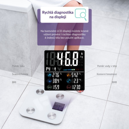 Svůj zdravý životní styl nejlépe podpoříte, budete-li dokonale rozumět svému tělu. Pomoci vám v tom může inteligentní váha TrueLife FitScale W7 BT. Kromě zjištění hmotnosti, provede také diagnostiku pomocí bioelektrické impedanční analýzy a vypočítá 19 měřitelných indexů, z toho 7 i bez použití aplikace. Své výsledky vidí uživatel na přehledném barevném LCD displeji. Váhu lze propojit prostřednictvím Bluetooth s mobilním telefonem a stažením aplikace získáte ještě detailnější přehled o tom, co se s vaším tělem děje. Váha je vyrobena z tvrzeného ITO skla, které je velmi odolné a má nosnost až 180 kg. Zaměřte se na své zdraví komplexně, pouhá hmotnost není tím hlavním ukazatelem.