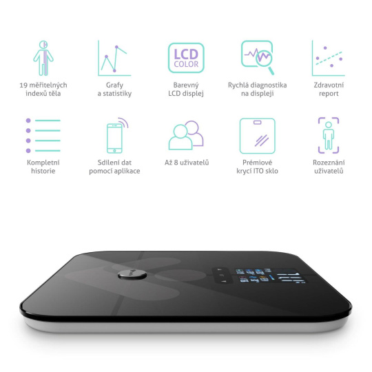 Inteligentní váha FitScale W7 BT automaticky rozpozná až 8 uživatelů, můžete si tak porovnávat výsledky celé rodiny. Jakmile si stáhnete aplikaci, která je kompletně v češtině, půjde to ještě snadněji. Kromě získání kompletního reportingu pro každého z uživatelů, lze údaje porovnávat či sledovat statistiky a vývoj na grafech. Aplikace je kompatibilní s Apple Health Kit, Fitbit a Google Fit a přináší rovněž detailní popis všech měřených indexů. Šikovná je i možnost nastavení notifikací a připomínek vážení, oceníte jistě možnost nastavení pro vážení dětí.