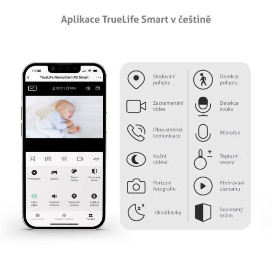 Dopřejte si klidu, protože víte, že je vaše děťátko v pořádku. Nenápadný strážce miminek i starších dětí v podobě chůvičky TrueLife NannyCam R3 Smart se postará, že budete mít svou ratolest neustále na očích, ať už jste kdekoliv. Chůvičku snadno spárujete se svým mobilním telefonem a v aplikaci TrueLife Smart, která je kompletně v českém jazyce. Můžete nejen sledovat, co dítě právě dělá, ale rovněž nastavit různé chytré funkce. Vše je snadné, rychlé a bezpečné. Rotační chůvička nepřetržitě monitoruje prostor, kde se dítě nachází a poskytuje obraz ve Full HD kvalitě. Umí detekovat pohyb, zvuk i teplotu a v pravý čas upozornit, když se něco děje. Ukolébavky zase pomohou vaše děťátko uspat a vytvořit mu příjemné prostředí.