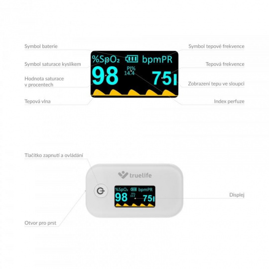 Oxymetr TrueLife X3 zajistí okamžité a přesné měření saturace krevního hemoglobinu kyslíkem a tepové frekvence. Naměřené hodnoty okamžitě a přehledně zobrazí na vestavěném displeji. Je vhodný zejména pro pacienty s respiračním onemocněním nebo onemocněním srdce, ale i pro vrcholové sportovce. Své uplatnění ale nalezne v lékárničce každé domácnosti.