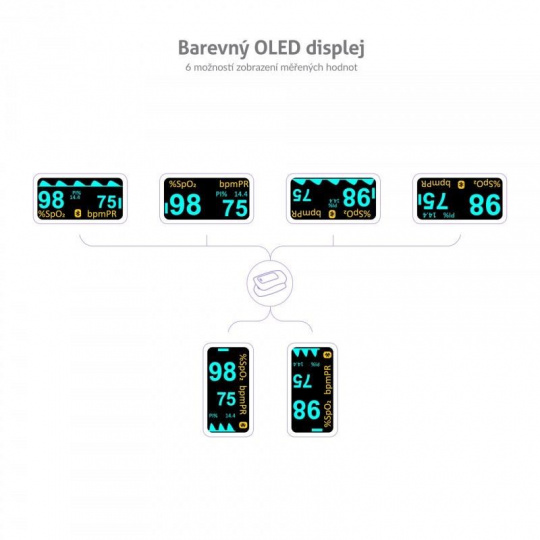 Oxymetr disponuje přehledným OLED displejem, jehož nastavení lze přizpůsobit dle vašich preferencí. Na výběr je 6 možností zobrazení měřených hodnot. Nastavit můžete i preferovanou intenzitu jasu, zvukový indikátor, či zvukový doprovod tepu. Díky zabudovanému Bluetooth lze oxymetr spárovat s chytrým telefonem. Naměřené hodnoty máte uchované v aplikaci, která je v češtině, a jejich historii tak máte neustále u sebe a můžete ji sdílet s lékaři nebo rodinnou. Vývoj měření vidíte v aplikaci na přehledném grafu.