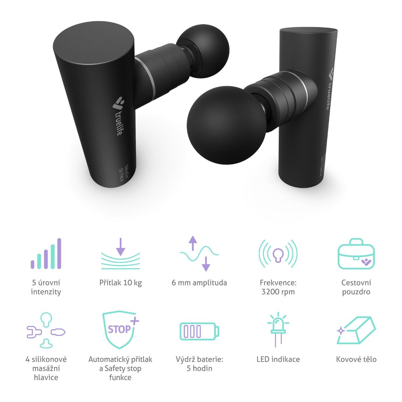 Příjemná masáž pro sport i sedavé zaměstnání, která napomůže od bolesti a ztuhlosti svalů, se občas hodí každému. Ne vždy je ale možnost zajít k masérovi, proto TrueLife přináší jednoho až k vám domů. Masážní pistole RelaxGun G6 Metal je vždy připravena se o vás postarat. Jejích 5 intenzit napomůže regeneraci svalů, zmírnění napětí, zlepšení krevního oběhu a uleví od stresu. Pistole téměř nic díky své malé velikosti neváží, snadno se s ní tedy manipuluje, avšak ukrývá velký výkon – sílu přítlaku 10 kg. Amplituda činí 6 mm a přístroj vykoná až 3200 kmitů za minutu. K dispozici jsou 4 vyměnitelné silikonové hlavice a šikovné bezpečnostní funkce Automatic pressure a Safety stop. Masážní pistole pracuje velmi tiše a její dobíjecí lithiová baterie zvládne provoz až 5 hodin. Hliníkové tělo nejen dobře vypadá, ale především vydrží. Masáž si můžete dopřát i na cestách, pistoli stačí vložit do přiloženého cestovního pouzdra.