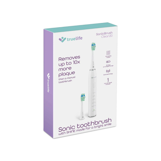 Sonická technologie představuje účinný způsob boje proti zubnímu plaku. Oproti rotačním kartáčkům je šetrnější k zubní sklovině a vířením vody s pastou pomáhá čistit i mezizubní prostory. SonicTrue® technologie funguje na bázi jemných vibrací, kdy oproti manuálnímu kartáčku, kterým uděláte přibližně 600 pohybů za minutu, zvládne TrueLife SonicBrush Clean30 za jednu minutu až 70 000 pohybů pro zářivý úsměv bez námahy. Hlavice kartáčku vydrží až 3 měsíce používání, poté se štětiny začnou třepit, ztrácí účinnost a navíc se na nich hromadí bakterie. Naštěstí jsou hlavice opatřeny modrými štětinami, které po 3 měsících vyblednou a vy tak víte, že je načase je vyměnit.