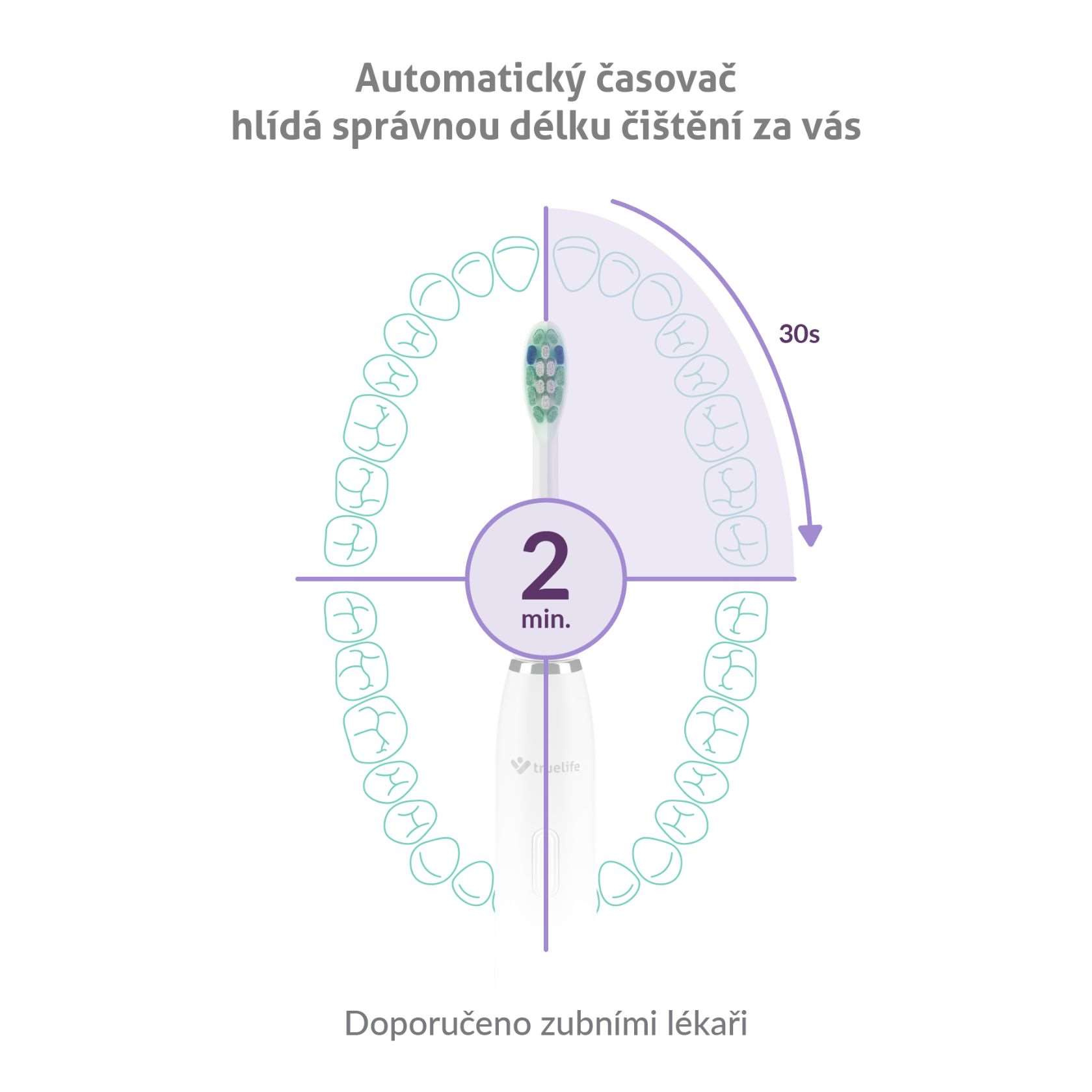 Sonický kartáček je nastaven, aby se automaticky vypnul po uplynutí ideální doby čištění, tedy 2 minutách.