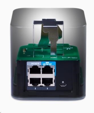 Router disponuje 3x 10/100Mbps LAN (první LAN port podporuje PoE IN), 1x 10/100Mbps LAN/WAN s podporou PoE Out, napájecím microUSB konektorem a 2x2 MIMO WiFi rádiovou částí s modulační rychlostí 300Mbps (2.4GHz).