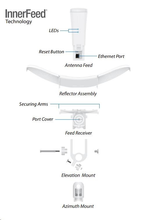 Uvnitř LiteBeamu se nachází výkonný MIPS procesor Atheros 74KC, kterému sekunduje 64MB operační paměti. Síťový port podporuje 10/100/1000 Ethernet a lze po něm jednotku napájet pasivním Gigabit PoE 24V/0,3A adaptérem, který není součástí balení.