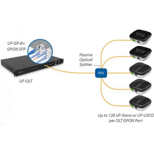 Na 1 GPON port můžete připojit až 128 CPE jednotek na vzdálenost až 20 km. UF-LOCO je kompatibilní s UF-OLT a také s některými OLT jednotkami dalších výrobců.