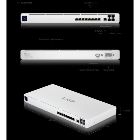 Popis produktu UISP-R-Pro je ideální router díky svému výkonu pro nasazení do firemní sféry. Router disponuje 8x Gigabit LAN, 1x Gigabit WAN, 4x SFP+ (podpora 1G i 10G) porty pro další rozšíření pomocí optického vlákna a 1,3" LCD dotykovým displejem pro jednoduché zobrazení o stavu a zatížení routeru. UISP Router Pro je funkcemi i porty nabitý router s důrazem na kvalitu, spolehlivost a jednoduchost instalace. Router lze napájet primárně přes 230V AC ze sítě ale i přes 27V DC Power TransPort konektor pro případnou redundanci. UISP Router Pro je spravován POUZE pomocí aplikace UISP, centralizované platformy, kde můžete monitorovat a spravovat všechna vaše zařízení UISP. Klíčové vlastnosti • (8) Gigabit LAN + (1) Gigabit WAN • (4) 10G SFP+ port • Montáž do 19" racku • Až 9500 Mbps propustnost v NATu / 2250 Mbps propustnost s QoS • Podpora Firewallu, OSPF routingu a shapingu • Napájení přes 230V AC ale i přes Power TransPort pro DC redundanci • Snadné nastavení pomocí technologie Bluetooth prostřednictvím mobilní aplikace UISP 1.4.5 a vyšší Obsah balení • Zařízení • Napájecí kabel • Rackmount kit Technické parametry Konektory a rozhraní Možnost více WAN:Ano Rychlost LAN:(8) 10/100/1000Mbps Gigabit LAN:Ano Optické rozhraní:(4) 1G/10Gbps Ostatní:Dotykový displej, Bluetooth Napájení Typ napájení:DC konektor, Ze sítě (230V) Redundantní napájení:Ano Max. spotřeba energie [W]:50 Napájení přes konektor/svorkovnici:27V DC, 230V AC Fyzické charakteristiky Provedení:Rackmount Šasi:Kovové Tlačítka:Reset Provozní teplota [°C]:-10 až 50 Šířka [mm]:442 Výška [mm]:44 Hloubka [mm]:200 Hardware CPU:ARM Cortex-A57 Frekvence CPU [MHz]:1700 Počet CPU jader:4 RAM [MB]:4096 Obecné Propustnost NAT [Mb/s]:9500 Software Management:UISP aplikace.