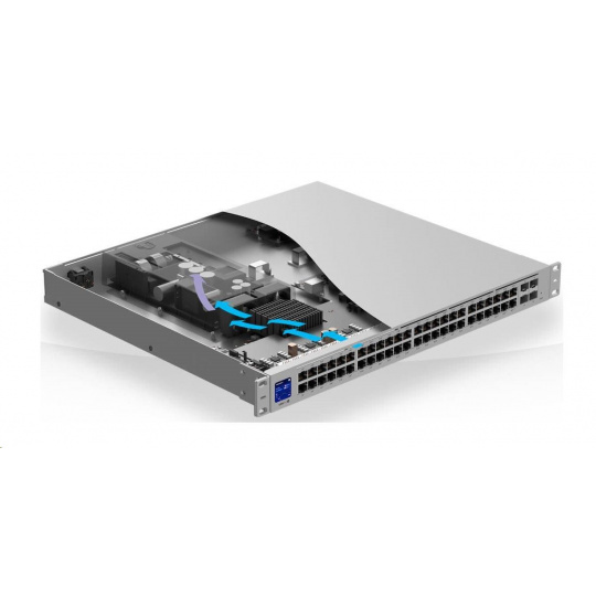 Jako Uplink poslouží dvojice portů 10G SFP+ se zpětnou kompatibilitou 1G SFP. Pro případ výpadku napájení nebo poruchy interního zdroje je možné switch připojit k záložnímu systému UniFi SmartPower, který obslouží až 6 podporovaných zařízení.