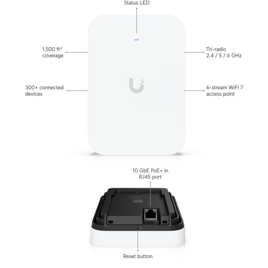 Popis produktu Ubiquiti U7-Pro-XG-Wall je Wi-Fi 7 UniFi AP. Jedná se o tri-band access point s rychlostí přenosu až 5,8Gbps v pásmu 6GHz, až 4,3Gbps v 5GHz pásmu a až 688 Mbps v pásmu 2,4GHz a pokročilým šifrováním WPA3. U7-Pro-XG-Wall je určeno k Wi-Fi pokrytí vaší domácnosti, kanceláře, hotelových prostor nebo skladu s podporou až 300+ připojených klientů. Plná podpora roamingu zajišťuje plynulé předávání připojených klientů mezi jednotlivými AP. Pro připojení do sítě je AP vybaveno 10G ETH portem, který slouží i pro napájení pomocí 802.3at PoE+. PoE injektor není součástí balení. Výhody UniFi řešení • Roaming - přechod mezi jednotlivými AP bez výpadků • Wireless uplink - ideální pro místa, kam nelze přivést datový kabel • Až 8 SSID • Detailní statistiky provozu • Guest síť • Load balancing - udržování rovnoměné zátěže / přepínání klientů • Omezování rychlosti pro každé SSID Obsah balení • Zařízení • Kit k přichycení na zeď • Sada šroubků Technické parametry Bezdrátové vlastnosti Bezdrátové frekvence:2.4 + 5 + 6 GHz (triple band) WiFi standardy:802.11n, 802.11a, 802.11ac, 802.11b/g, 802.11ax, 802.11be MU-MIMO:Ano Přenosová rychlost - 5GHz [Mb/s]:2880 Přenosová rychlost - 2.4GHz [Mb/s]:688 Přenosová rychlost - 6GHz [Mb/s]:5800 Vysílací výkon 2.4GHz [dBm]:23 Vysílací výkon 5GHz [dBm]:26 Vysílací výkon 6GHz [dBm]:24 Šifrování:WPA, WPA2, WPA3 2.4GHz MIMO:2 x 2 5GHz MIMO:2 x 2 6GHz MIMO:2 x 2 Typ antény:Vestavěná Počet vestavěných antén:6 Roaming:Ano Zisk antény [dBi]:6, 4 Konektory a rozhraní Rychlost LAN:(1) 100M/1G/2.5G/5G/10G Gigabit LAN:Ano Napájení Napájení přes PoE:802.3at, 42 .. 57V DC Typy PoE:PoE-In (pouze) Max. spotřeba energie [W]:22 Fyzické charakteristiky Provedení:Na zeď Použití:Vnitřní Tlačítka:Reset Provozní teplota [°C]:-30 až 40 Hmotnost [g]:505 Šířka [mm]:108 Výška [mm]:155 Hloubka [mm]:34 Software Operační mód:Access Point Výchozí IP adresa:192.168.1.20, Dynamická z DHCP.