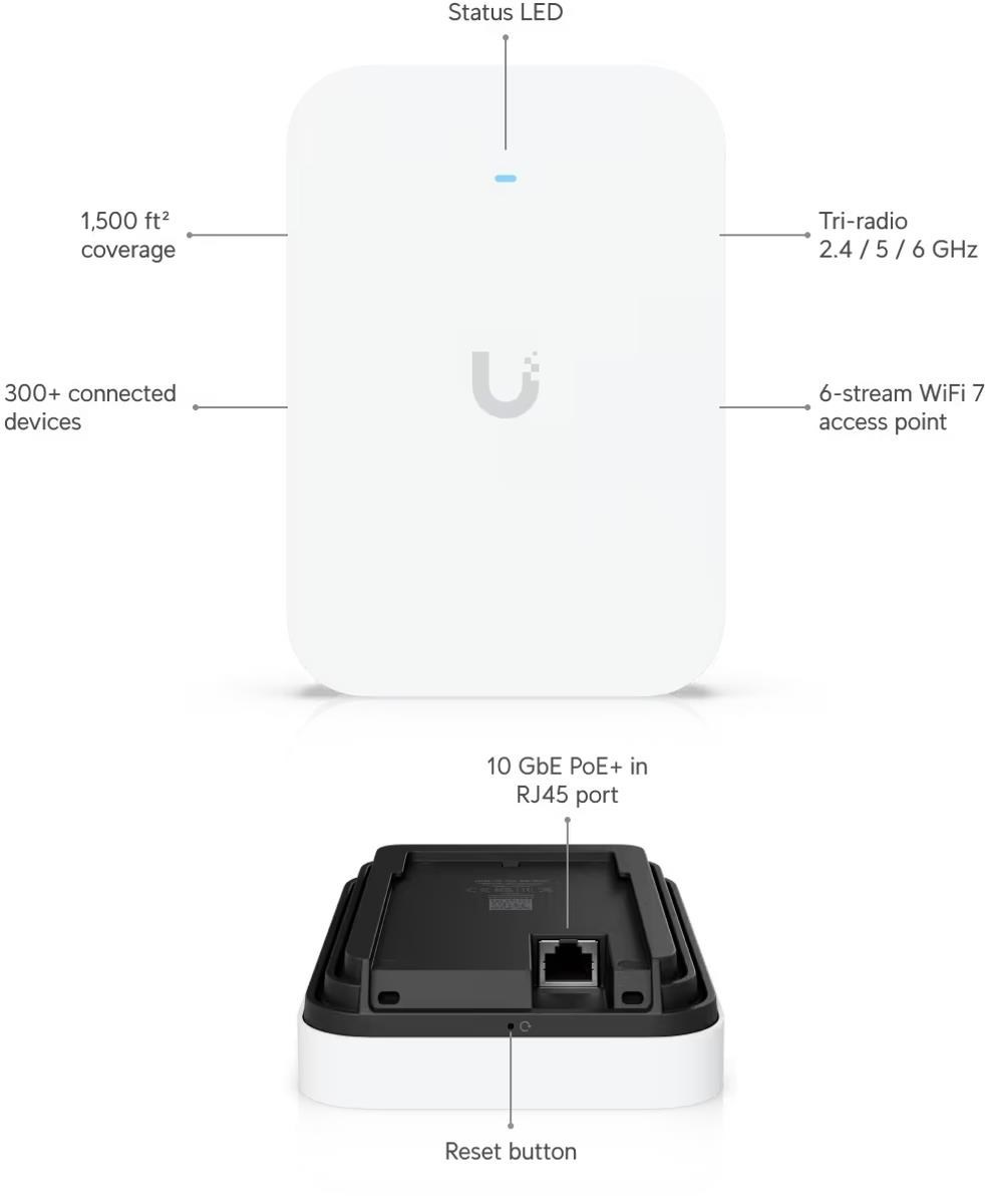 Popis produktu Ubiquiti U7-Pro-XG-Wall je Wi-Fi 7 UniFi AP. Jedná se o tri-band access point s rychlostí přenosu až 5,8Gbps v pásmu 6GHz, až 4,3Gbps v 5GHz pásmu a až 688 Mbps v pásmu 2,4GHz a pokročilým šifrováním WPA3. U7-Pro-XG-Wall je určeno k Wi-Fi pokrytí vaší domácnosti, kanceláře, hotelových prostor nebo skladu s podporou až 300+ připojených klientů. Plná podpora roamingu zajišťuje plynulé předávání připojených klientů mezi jednotlivými AP. Pro připojení do sítě je AP vybaveno 10G ETH portem, který slouží i pro napájení pomocí 802.3at PoE+. PoE injektor není součástí balení. Výhody UniFi řešení • Roaming - přechod mezi jednotlivými AP bez výpadků • Wireless uplink - ideální pro místa, kam nelze přivést datový kabel • Až 8 SSID • Detailní statistiky provozu • Guest síť • Load balancing - udržování rovnoměné zátěže / přepínání klientů • Omezování rychlosti pro každé SSID Obsah balení • Zařízení • Kit k přichycení na zeď • Sada šroubků Technické parametry Bezdrátové vlastnosti Bezdrátové frekvence:2.4 + 5 + 6 GHz (triple band) WiFi standardy:802.11n, 802.11a, 802.11ac, 802.11b/g, 802.11ax, 802.11be MU-MIMO:Ano Přenosová rychlost - 5GHz [Mb/s]:2880 Přenosová rychlost - 2.4GHz [Mb/s]:688 Přenosová rychlost - 6GHz [Mb/s]:5800 Vysílací výkon 2.4GHz [dBm]:23 Vysílací výkon 5GHz [dBm]:26 Vysílací výkon 6GHz [dBm]:24 Šifrování:WPA, WPA2, WPA3 2.4GHz MIMO:2 x 2 5GHz MIMO:2 x 2 6GHz MIMO:2 x 2 Typ antény:Vestavěná Počet vestavěných antén:6 Roaming:Ano Zisk antény [dBi]:6, 4 Konektory a rozhraní Rychlost LAN:(1) 100M/1G/2.5G/5G/10G Gigabit LAN:Ano Napájení Napájení přes PoE:802.3at, 42 .. 57V DC Typy PoE:PoE-In (pouze) Max. spotřeba energie [W]:22 Fyzické charakteristiky Provedení:Na zeď Použití:Vnitřní Tlačítka:Reset Provozní teplota [°C]:-30 až 40 Hmotnost [g]:505 Šířka [mm]:108 Výška [mm]:155 Hloubka [mm]:34 Software Operační mód:Access Point Výchozí IP adresa:192.168.1.20, Dynamická z DHCP.