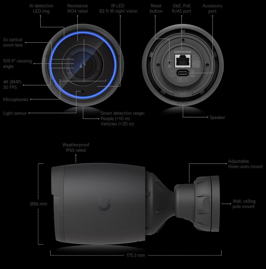 Popis produktu Bullet kamera AI Professional od Ubiquiti Networks je kamera s 8MP rozlišením (3840 x 2160px při 30 fps), opravdu velkým 1/1.8" senzorem, varifokálním objektivem 4.1 až 12.3mm, motorickým 3x optickým zoomem, pozorovacím úhlem 35 až 110°, integrovanými vysokovýkonnými infračervenými LED diodami pro noční vidění, mikrofonem, reproduktorem, stupněm krytí IP65 proti vodě a antivandal ochraně IK04. Kamera ke komunikaci směrem do sítě využívá Gigabitový LAN port s podporou napájení přes 802.3af PoE s maximální spotřebou 11W. UniFi Protect Software UniFi Protect Controller je výkonná integrovaná IP video monitorovací platforma určená pro práci s kamerami UniFi Protect a mobilní aplikací UniFi Protect. Klíčové vlastnosti • 4K rozlišení - 8MP, 3840 x 2160px při 30 fps • 3x optický zoom • IR přísvit s automatickým IR cut filtrem • Pokročilá AI detekce: detekce lidí, čtění SPZ a další • Integrovaný audio mikrofon a reproduktor • IP65 krytí + antivandal IK04 Obsah balení • Zařízení • Držák na zeď • Příchytový materiál Technické parametry Kamera Typ objektivu:Varifokální - motorický Objektiv [mm]:4,1 až 12,3 (nastavitelný) Přísvit:IR Pozorovací úhel [°]:35 až 110 Režim den/noc:IR cut filtr Obrazový senzor ["]:1/1.8 Obraz Rozlišení:8MP Technologie a vymoženosti:Čtení SPZ Max. rozlišení [pixely]:3840 x 2160 (4K UHD) Konektory a rozhraní Audio:Mikrofon, Reproduktor Rychlost LAN:(1) 10/100/1000Mbps Napájení Napájení přes PoE:37 .. 57V DC Typ napájení:PoE Max. spotřeba energie [W]:11 Fyzické charakteristiky Stupeň krytí:IP65 Použití:Venkovní Antivandal (ochrana proti nárazu):IK4 Provozní teplota [°C]:-20 až 50 Hmotnost [g]:820 Šířka [mm]:86 Výška [mm]:86 Hloubka [mm]:175 Barva:Černá Kompresní standardy Video komprese:H.264 Obecné Kamerová řada:UniFi Protect Software Výchozí IP adresa:Dynamická z DHCP.